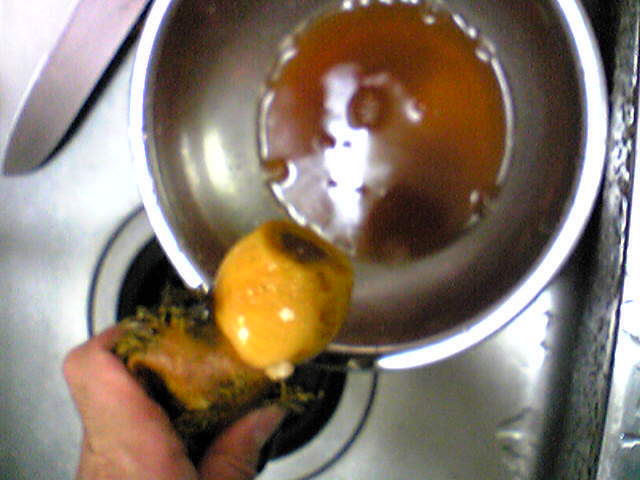 ②次に中身のマンゴーみたいな部分を殻からしぼり出します。